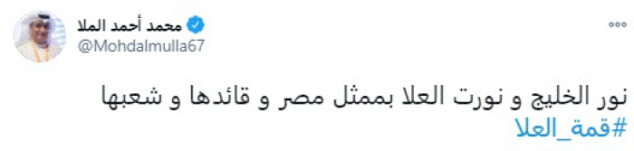 وقال في تغريدة عبر "تويتر" رصدها "المشهد العربي": "نور الخليج ونورت العلا بممثل مصر وقائدها وشعبها قمة العلا".