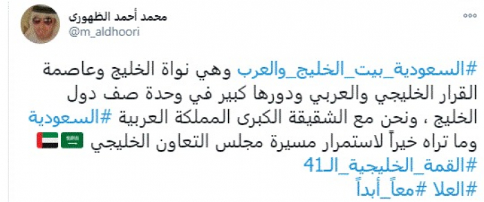 وكتب في تغريدة عبر "تويتر" رصدها "المشهد العربي": "السعودية بيت الخليج والعرب وهي نواة الخليج وعاصمة القرار الخليجي والعربي ودورها كبير في وحدة صف دول الخليج".