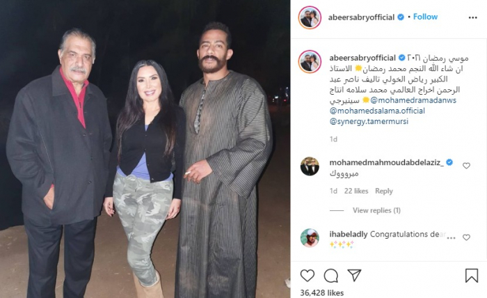 ونشرت "عبير" صورة تجمعها بأبطال العمل، عبر حسابها الرسمي بموقع إنستجرام، وعلقت: "موسى.. رمضان ٢٠٢١ إن شاء الله، النجم محمد رمضان والأستاذ الكبير رياض الخولي.. تأليف ناصر عبد الرحمن، وإخراج العالمي محمد سلامة وإنتاج سينرجي".
