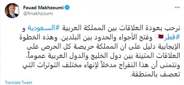 رحب السياسي اللبناني البارز فؤاد مخزومي، اليوم، بخطوة فتح الأجواء والحدود بين السعودية وقطر، متمنيًا أن يكون ذلك خطوة لإنهاء مختلف الأزمات في المنطقة.
