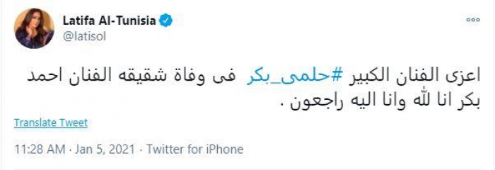 قدّمت المطربة التونسية لطيفة، رسالة عزاء للملحن المصري الكبير حلمي بكر في وفاة شقيقه أحمد بكر.