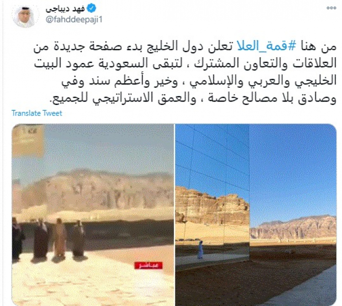 وقال في تغريدة عبر "تويتر" رصدها "المشهد العربي": "من هنا قمة العلا تعلن دول الخليج بدء صفحة جديدة من العلاقات والتعاون المشترك ، لتبقى السعودية عمود البيت الخليجي والعربي والإسلامي، وخير وأعظم سند وفي وصادق بلا مصالح خاصة، والعمق الاستراتيجي للجميع".