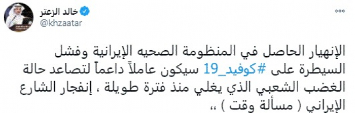 وقال في تغريدة عبر "تويتر" رصدها "المشهد العربي": "الإنهيار الحاصل في المنظومة الصحيه الإيرانية وفشل السيطرة على كوفيد 19 سيكون عاملاً داعماً لتصاعد حالة الغضب الشعبي الذي يغلي منذ فترة طويلة، انفجار الشارع الإيراني (مسألة وقت)".