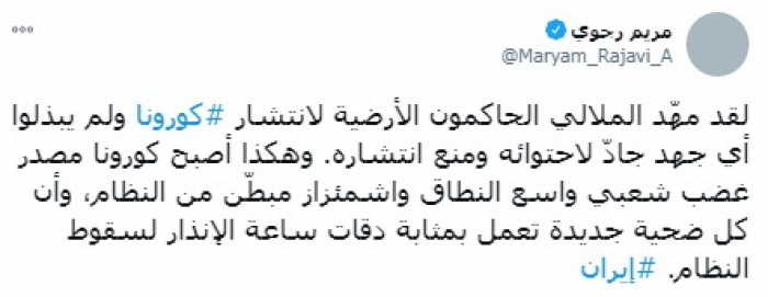 وأوضحت في تغريدة على حسابها بموقع التدوين المصغر تويتر، اليوم: "لقد مهّد الملالي الحاكمون الأرضية لانتشار كورونا، ولم يبذلوا أي جهد جادّ لاحتوائه ومنع انتشاره".