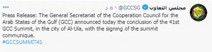 وقال في تغريدته: "أعلنت الأمانة العامة لمجلس التعاون لدول الخليج العربية، اليوم، اختتام أعمال القمة الخليجية الـ 41 في مدينة العلا، بالتوقيع على بيان القمة".
