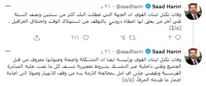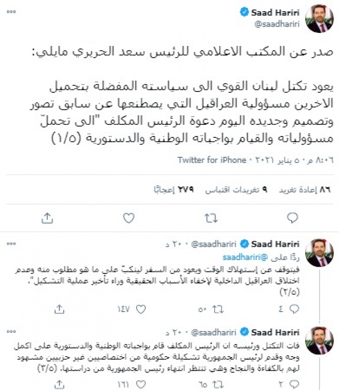 وأضاف أن: "جديده اليوم دعوة الرئيس المكلف (إلى تحملّ مسؤولياته والقيام بواجباته الوطنية والدستورية) فيتوقف عن استهلاك الوقت ويعود من السفر لينكبّ على ما هو مطلوب منه وعدم اختلاق العراقيل الداخلية لإخفاء الأسباب الحقيقية وراء تأخير عملية التشكيل".