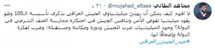 وقال في تغريدة على حسابه بموقع التدوين المصغر تويتر، اليوم إني: "لا أفهم كيف يمكن أن يهنئ ميليشياوي الجيش العراقي بذكرى تأسيسه الـ100 وهو يقود ميليشيا تقوض الأمن وتنافس الجيش في احتكاره ممارسة العنف الشرعي في الدولة؟".