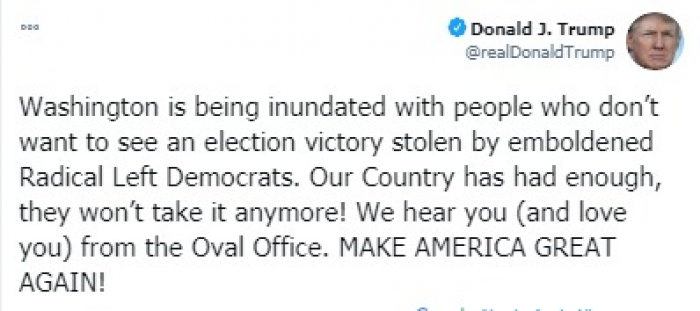 وقال في تغريدة على حسابه بموقع التدوين المصغر تويتر، اليوم إن: "واشنطن تغرق بأشخاص لا يريدون أن يروا انتصارًا انتخابيًا يُسرق من قبل الديمقراطيين اليساريين الراديكاليين".