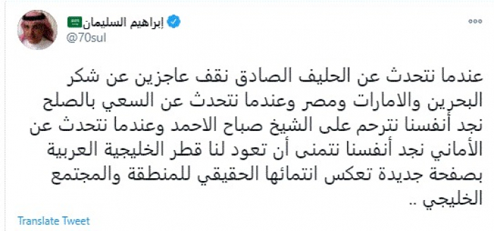 وقال في تغريدة عبر "تويتر" رصدها "المشهد العربي": "عندما نتحدث عن الحليف الصادق نقف عاجزين عن شكر البحرين والإمارات ومصر وعندما نتحدث عن السعي بالصلح نجد أنفسنا نترحم على الشيخ صباح الأحمد وعندما نتحدث عن الأماني نجد أنفسنا نتمنى أن تعود لنا قطر الخليجية العربية بصفحة جديدة تعكس انتمائها الحقيقي للمنطقة والمجتمع الخليجي".