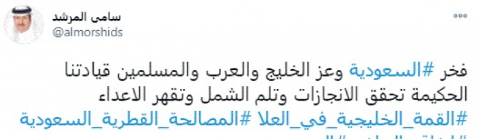 وقال في تغريدة عبر "تويتر" رصدها "المشهد العربي": "فخر السعودية وعز الخليج والعرب والمسلمين قيادتنا الحكيمة تحقق الانجازات وتلم الشمل وتقهر الأعداء".