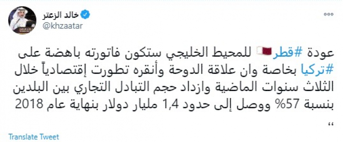 وكتب في تغريدة عبر "تويتر" رصدها "المشهد العربي": "عودة قطر للمحيط الخليجي ستكون فاتورته باهضة على تركيا بخاصة وان علاقة الدوحة وأنقره تطورت إقتصادياً خلال الثلاث سنوات الماضية وازداد حجم التبادل التجاري بين البلدين بنسبة 57% ووصل إلى حدود 1,4 مليار دولار بنهاية عام 2018".