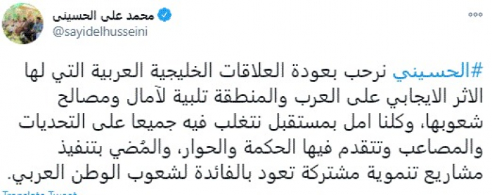 وكتب في تغريدة عبر "تويتر" رصدها "المشهد العربي": "الحسيني نرحب بعودة العلاقات الخليجية العربية التي لها الاثر الايجابي على العرب والمنطقة تلبية لآمال ومصالح شعوبها، وكلنا امل بمستقبل نتغلب فيه جميعا على التحديات والمصاعب وتتقدم فيها الحكمة والحوار، والمُضي بتنفيذ مشاريع تنموية مشتركة تعود بالفائدة لشعوب الوطن العربي".