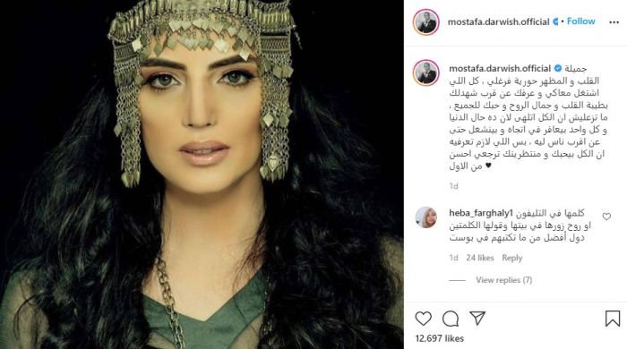 ونشر مصطفى درويش صورة حورية فرغلي عبر حسابه الرسمي بموقع "إنستجرام": "جميلة القلب والمظهر حورية فرغلي، كل اللي اشتغل معاكي وعرفك عن قرب شهد لك بطيبة القلب وجمال الروح وحبك للجميع، ما تزعليش أن الكل اتلهى لأن ده حال الدنيا وكل واحد بيعافر في اتجاه وبينشغل حتى عن أقرب ناس ليه، بس اللي لازم تعرفيه أن الكل بيحبك ومنتظرينك ترجعي أحسن من الأول".