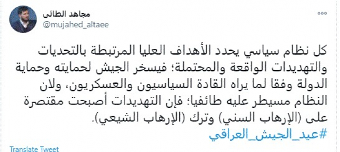 وكتب في تغريدة عبر "تويتر" رصدها "المشهد العربي": "كل نظام سياسي يحدد الأهداف العليا المرتبطة بالتحديات والتهديدات الواقعة والمحتملة؛ فيسخر الجيش لحمايته وحماية الدولة وفقا لما يراه القادة السياسيون والعسكريون، ولان النظام مسيطر عليه طائفيا؛ فإن التهديدات أصبحت مقتصرة على (الإرهاب السني) وترك (الإرهاب الشيعي)".