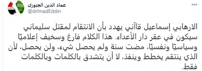 رد المحلل السياسي العراقي عماد الدين الجبوري، اليوم، على التهديدات التي أطلقها قائد فيلق القدس إسماعيل قاآني بشأن الانتقام لمقتل قاسم سليماني.
