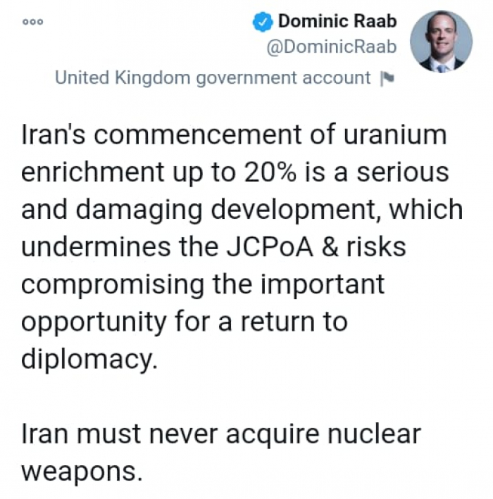 رفض وزير خارجية بريطانيا دومينيك راب رفع إيران تخصيب اليورانيوم إلى 20%، مؤكدا أنه يجب ألا تملك طهران أسلحة نووية أبدا.