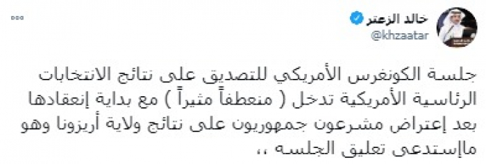 وشدد في تغريدة على حسابه بموقع التدوين المصغر تويتر اليوم على أن: "جلسة الكونغرس الأمريكي للتصديق على نتائج الانتخابات الرئاسية الأمريكية تدخل (منعطفًا مثيرًا) مع بداية انعقادها بعد اعتراض مشرعون جمهوريون على نتائج ولاية أريزونا وهو ما استدعى تعليق الجلسة".
