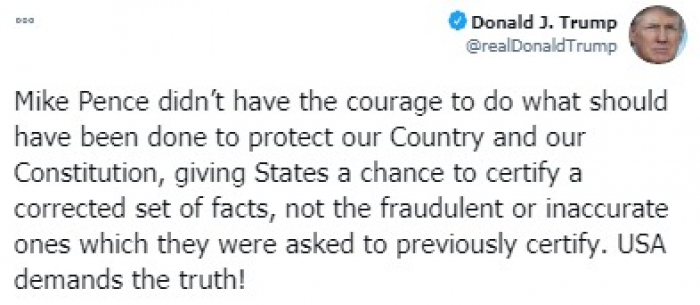 وأوضح في تغريدة على حسابه بموقع التدوين المصغر تويتر اليوم أنه: "لم يكن لدى مايك بنس الشجاعة لفعل ما كان يجب القيام به لحماية بلدنا ودستورنا، ليمنح الولايات فرصة للتصديق على مجموعة من الحقائق المصححة، وليس المزورة أو غير الدقيقة التي طُلب منهم التصديق عليها مسبقًا".