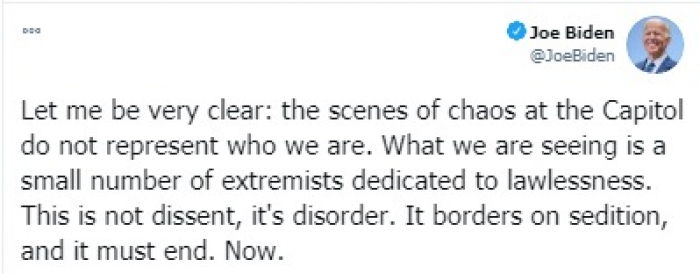 وقال في تغريدة على حسابها بموقع التدوين المصغر تويتر، اليوم: "اسمحوا لي أن أكون واضحا جدا: مشاهد الفوضى في مبنى الكابيتول لا تمثل من نحن".