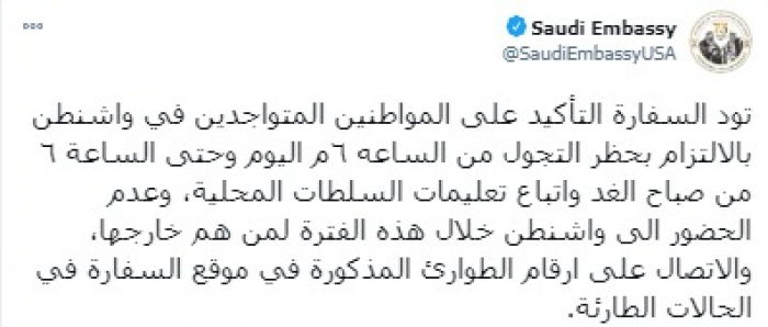 طالبت سفارة المملكة العربية السعودية في الولايات المتحدة مواطنيها من المتواجدين في أمريكا، إلى عدم دخول العاصمة واشنطن.