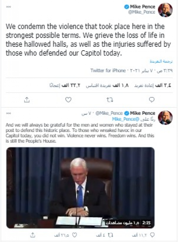 أدان مايك بنس نائب الرئيس الأمريكي المنتهية ولايته دونالد ترامب، أعمال العنف والشغب التي استهدفت مقر الكونجرس مساء الأربعاء.
