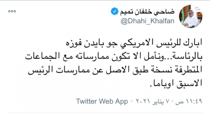 هنأ نائب مدير الشرطة والأمن العام في دبي الفريق ضاحي خلفان، الرئيس الأمريكي المنتخب جو بايدن، فوزه بالرئاسة، موجهًا له رسالة مفادها أن يكون حاسمًا ضد الجماعات المتطرفة والإرهابية.
