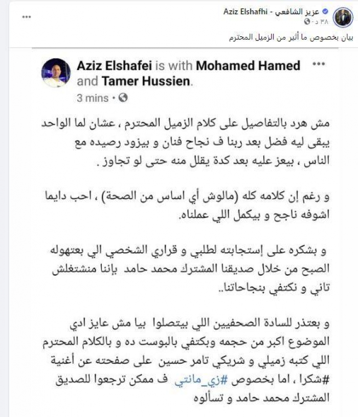 وتابع: "رغم إن كلامه كله (مالوش أي أساس من الصحة)، أحب دايما أشوفه ناجح و بيكمل اللي عملناه، و بشكره على إستجابته لطلبي و قراري الشخصي الي بعتهوله الصبح من خلال صديقنا المشترك محمد حامد بإننا منشتغلش تاني و نكتفي بنجاحاتنا، وبعتذر للسادة الصحفيين اللي بيتصلوا بيا مش عايز أدي الموضوع أكبر من حجمه".