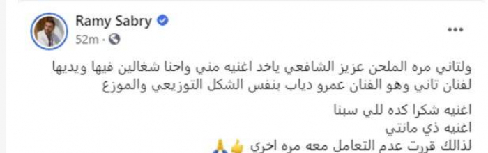 وكتب رامي، عبر حسابه على فيسبوك، قائلاً: "ولتاني مرة .. الملحن عزيز الشافعي، ياخد أغنية مني وإحنا شغالين فيها، ويديها لفنان تاني وهو الفنان عمرو دياب، بنفس الشكل التوزيعي والموزع، أغنية شكرا كده للي سابنا وأغنية زي ما أنتي .. لذلك قررت عدم التعامل معه مرة أخرى".