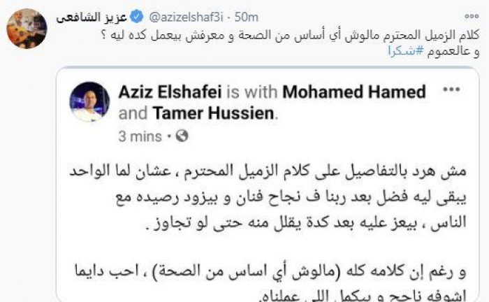 وكتب الشافعي، عبر حسابه على تويتر: "كلام الزميل المحترم مالوش أي أساس من الصحة و معرفش بيعمل كده ليه؟.. وعلى العموم شكرًا".