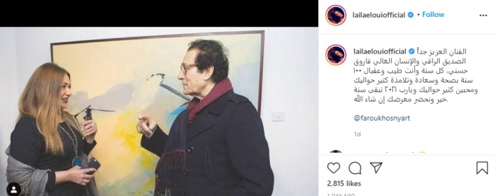 ونشرت علوي، صورة تجمعهما عبر حسابها على إنستجرام، وعلقت: "الفنان العزيز جدًا الصديق الراقي والإنسان الغالي فاروق حسني.. كل سنة وأنت طيب وعقبال ١٠٠ سنة بصحة وسعادة.. وتلامذة كتير حواليك ومحبين كتير حواليك.. ويا رب ٢٠٢١ تبقى سنة خير، ونحضر معرضك إن شاء الله".