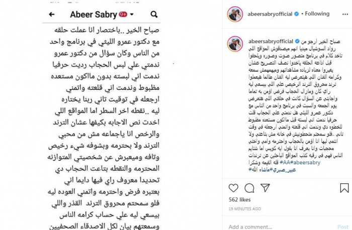 وكتبت عبير صبري منشورًا، عبر حسابها الرسمي بموقع "إنستجرام"، :" صباح الخير أرجو من رواد السوشيال ميديا أنهم ميصدقوش المواقع اللي تاخد كلام في برنامج متصور صوت وصوره ويلحقوا قبل إذاعة الحلقة ياخدوا نصف التصريح عشان يغيروا معناه زيادة مشاهداتهم وميهمهمش سمعة وكرامة الفنان اللي هيتعرض ليه الفنان طالما هيعملوا ترند".