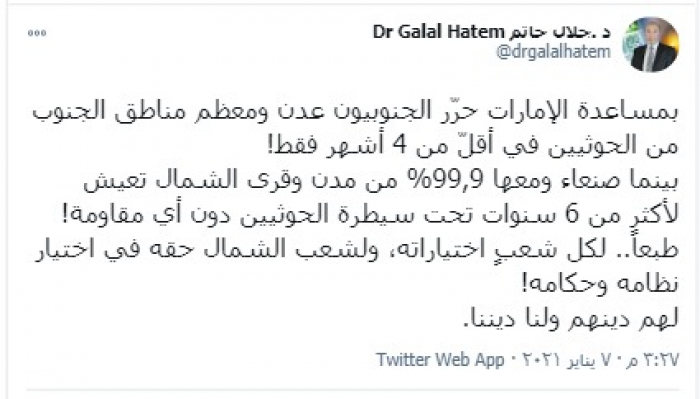 وكتب "حاتم" تغريدة عبر حسابه الشخصي بتويتر، رصدها "المشهد العربي": "بمساعدة الإمارات حرّر الجنوبيون عدن ومعظم مناطق الجنوب من الحوثيين في أقلّ من 4 أشهر فقط".