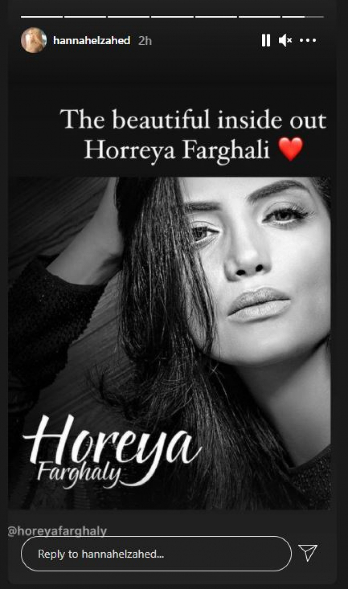 ونشرت هنا الزاهد، صورة لحورية فرغلى، عبر خاصية استورى على حسابها على إنستجرام، وكتبت قائلة: الجميلة من الداخل والخارج حورية.