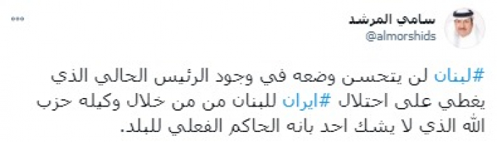 وقال في تغريدة على حسابه بموقع التدوين المصغر تويتر، اليوم إن: "لبنان لن يتحسن وضعه في وجود الرئيس الحالي الذي يغطي على احتلال إيران للبنان من خلال وكيله حزب الله الذي لا يشك أحد بأنه الحاكم الفعلي للبلد".
