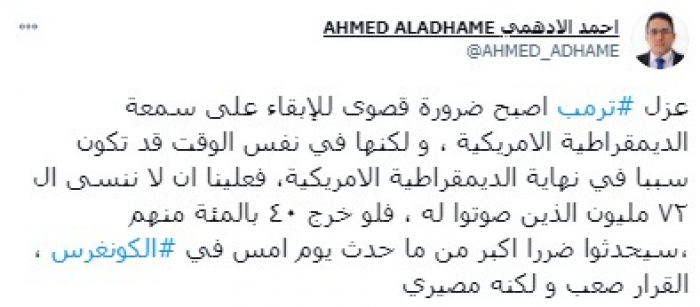 أكد الإعلامي العراقي أحمد الأدهمي أن عزل الرئيس الأمريكي من منصبه أصبح ضرورة لحماية الديمقراطية الأمريكية، مشيرا إلى أنه قرار مصيري.