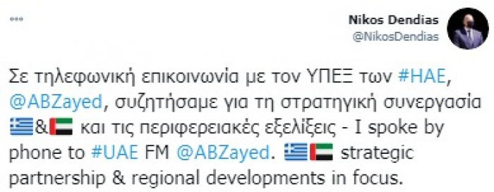 كشف وزير الخارجية اليوناني، نيكوس دندياس، عن اتصاله هاتفيا بنظيره الإماراتي عبدالله بن زايد.