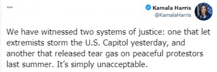 وقالت في تغريدة على حسابها بموقع التدوين المصغر تويتر، اليوم إننا: "لقد شهدنا نظامين للعدالة: أحدهما سمح للمتطرفين باقتحام مبنى الكابيتول الأمريكي أمس، والآخر أطلق الغاز المسيل للدموع على المتظاهرين السلميين الصيف الماضي"، مشددة على أن كلاهما: "ببساطة غير مقبولين".