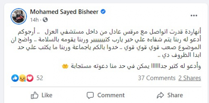 وعن حالته الصحية قال "بشير": "واضح إن الموضوع صعب قوي، خدوا بالكم يا جماعة وربنا ما يكتب على حد أبدًا الظروف دي، إدعوا له كتير جدًا يمكن في حد منا دعوته مستجابة".