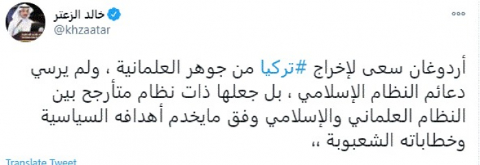 وكتب في تغريدة عبر "تويتر" رصدها "المشهد العربي": "أردوغان سعى لإخراج تركيا من جوهر العلمانية، ولم يرسي دعائم النظام الإسلامي، بل جعلها ذات نظام متأرجح بين النظام العلماني والإسلامي وفق ما يخدم أهدافه السياسية وخطاباته الشعبوية".