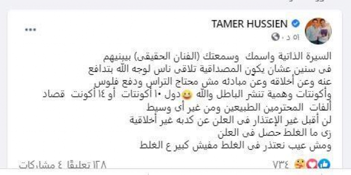 تامر حسين علق على ما تردد، وكتب: "السيرة الذاتية واسمك وسمعتك (الفنان الحقيقي) بيبنيهم في سنين عشان يكوِن المصداقية تلاقي ناس لوجه الله بتدافع عنه، وعن أخلاقه وعن مبادئه مش محتاج ألتراس ودفع فلوس، وأكونتات وهمية تنشر الباطل، والله دول ١٠ أكونتات أو ١٤ أكونت قصاد آلاف المحترمين الطبيعيين ومن غير أي وسيط ".