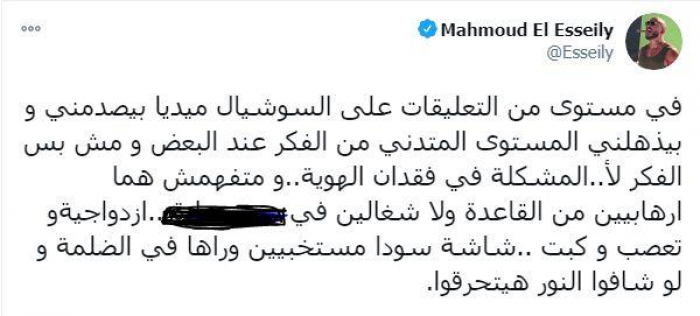 وغرد "العسيلي"، عبر حسابه بـ"تويتر" قائلًا: "في مستوى من التعليقات على السوشيال ميديا بيصدمني وبيذهلني المستوى المتدني من الفكر عند البعض ومش بس الفكر لأ، المشكلة في فقدان الهوية".