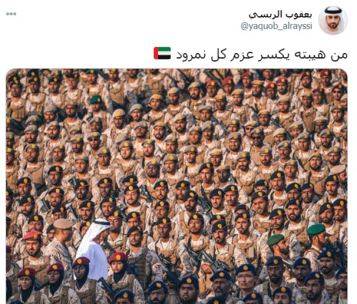 نشر الكاتب الإماراتي يعقوب الريسي، اليوم، صورة لولي عهد أبوظبي نائب القائد الأعلى للقوات المسلحة الإماراتية الشيخ محمد بن زايد آل نهيان، مؤكدًا أن هيبته تكسر عزم كل الأعداء.