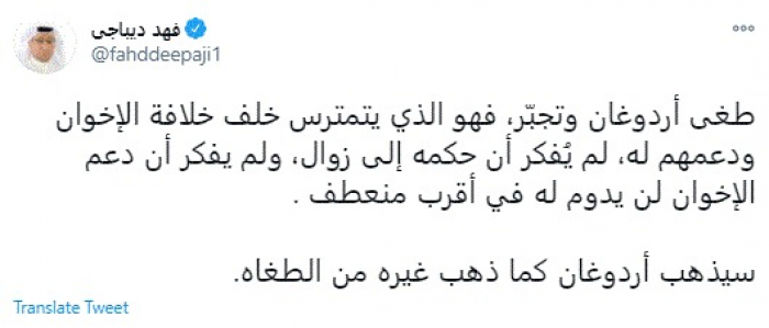 وقال في تغريدة عبر "تويتر" رصدها "المشهد العربي": "طغى أردوغان وتجبّر، فهو الذي يتمترس خلف خلافة الإخوان ودعمهم له، لم يُفكر أن حكمه إلى زوال، ولم يفكر أن دعم الإخوان لن يدوم له في أقرب منعطف".