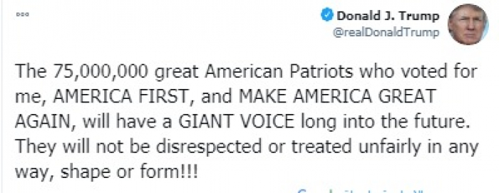 وأكد في تغريدة على حسابه بموقع التدوين المصغر تويتر، اليوم أن: "75.000.000 من الوطنيين الأمريكيين العظماء الذين صوتوا لي، سيكون لديهم صوت هائل لفترة طويلة في المستقبل".