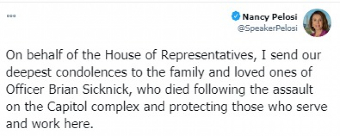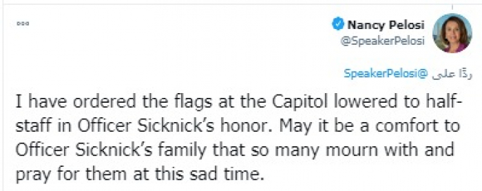 أمرت رئيسة مجلس النواب الأمريكي نانسي بيلوسي، بتنكيس أعلام مبنى الكونجرس إلى النصف، حدادا على الضابط برايان سيكنيك، الذي توفي جراء اقتحام مؤيدي أنصار الرئيس الأمريكي للمبنى.