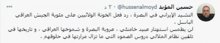 هاجم الناشط السياسي حسين المؤيد، من وصفهم بالخونة الموالين لإيران، الذين عمدوا على بث النشيد الإيراني في البصرة، خلال احتفالات بمرور 100 عام على تأسيس الجيش العراقي.