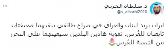 وقال في تغريدة على حسابه بموقع التدوين المصغر تويتر، اليوم إن: "إيران تريد لبنان والعراق في صراع طائفي يبقيهما ضعيفتان تابعتان للفُرس".