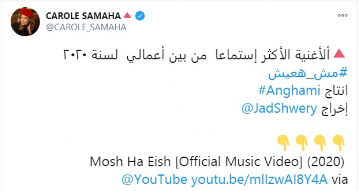 كشفت الفنانة كارول سماحة، عن أغنيتها الأكثر استماعا بين أعمالها في عام 2020.