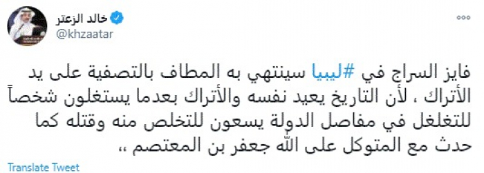 وقال في تغريدة عبر "تويتر" رصدها "المشهد العربي": "فايز السراج في ليبيا سينتهي به المطاف بالتصفية على يد الأتراك، لأن التاريخ يعيد نفسه والأتراك بعدما يستغلون شخصاً للتغلغل في مفاصل الدولة يسعون للتخلص منه وقتله كما حدث مع المتوكل على الله جعفر بن المعتصم".