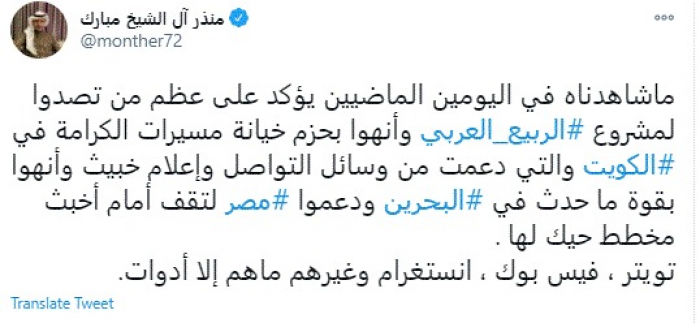 وكتب في تغريدة عبر "تويتر" ر صدها "المشهد العربي": "ما شاهدناه في اليومين الماضيين يؤكد على عظم من تصدوا لمشروع الربيع العربي وأنهوا بحزم خيانة مسيرات الكرامة في الكويت والتي دعمت من وسائل التواصل وإعلام خبيث وأنهوا بقوة ما حدث في البحرين ودعموا مصر لتقف أمام أخبث مخطط حيك لها".